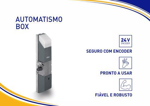 Ditec BOX é a solução ideal para automatizar portas basculantes com contrapesos. Pode movimentar, com 1 ou 2 motorredutores, quer portas basculantes com contrapesos com tela standard, quer portas com reentrada total ou articuladas. Fácil de instalar, automatiza portas até 7m² com um só operador e até 12m² com 2 motores em paralelo. Automatismo equipado com luz de cortesia, base de fixação e desbloqueio por chave já cablado. Fins de curso de abertura já montados e botão de abertura a bordo, consulte-nos.